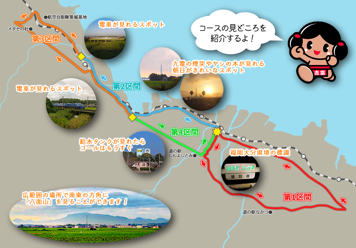 ウォーキングの前半は夜間なので景色を楽しむ場面は少ないですが、夜明けとともに様々な風景を楽しむことができます。こちらのページでは、そんなコースの見どころを少しだけご紹介します。